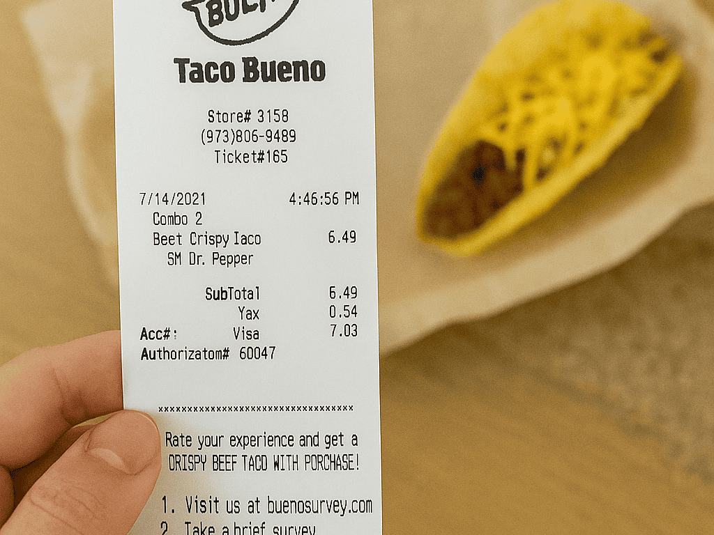 The reward may vary, but most Taco Bueno surveys offer a free item (like a taco or bean burrito) when you purchase something else on your next visit. The exact details should be printed on your receipt.